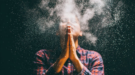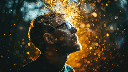 A man's hair bursts into a cascade of tiny particles, radiating outward in a vibrant explosion of energy. The bright, dynamic particles symbolize creativity and transformation, creating a surreal and striking visual impact.