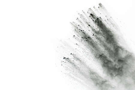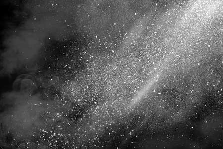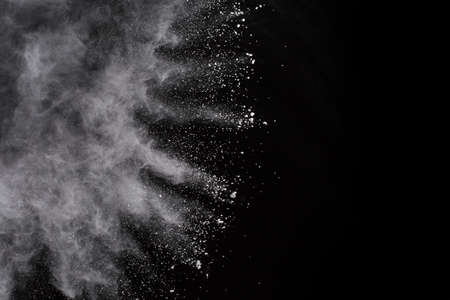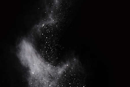 Freeze motion of white powder exploding, isolated on black, dark background. Abstract design of white dust cloud. Particles explosion screen saver, wallpaper with copy space. Planet creation concept