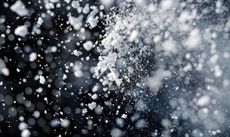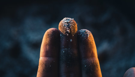 A close-up view of a hand releasing a cloud of shimmering particles against a dark background, showcasing motion and artistic expression in a unique way.