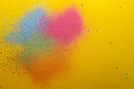 Mixture of multicolored powder is scattered randomly on a yellow background. Copy space. Abstract texture. Top view.