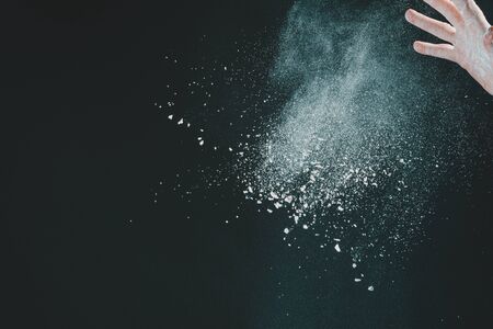 Hand of european woman chef in kitchen pouring flour on black background 2020