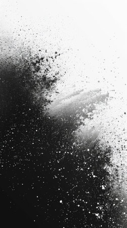 An abstract black and white splatter design, creating a visually dynamic effect with contrasting tones and artistic texture.