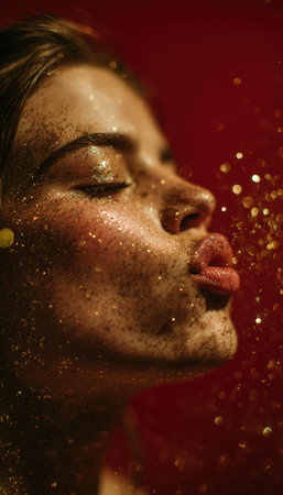 Vertical portrait of a woman blowing glittering confetti, with gold sequins reflecting warm light. The rich red background enhances the vibrant festive vibe of the image.