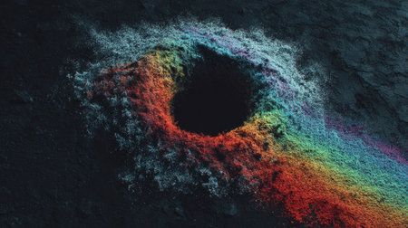 This abstract image features a dark hole surrounded by colorful topography. The composition utilizes a wide angle, showcasing a variety of hues, gradients, and textures. The overall aesthetic is evocative, suitable for artistic, design, or conceptual projects. The image can be used for a wide variety of commercial or editorial purposes.