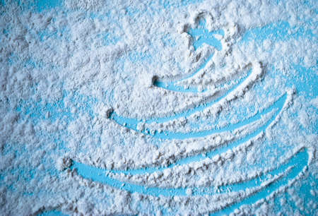 Ingredients for cooking Christmas baking: fir tree made from flour on a light table, kitchen utensils, top view.
