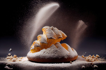 croissant sponge cake crumbs with powdered sugar for breakfast, created with generative ai