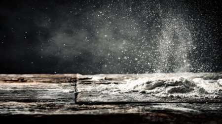 A dramatic explosion of flour dust creates an artistic scene, showcasing dynamic movements and textures against a rich dark background in a kitchen setting.