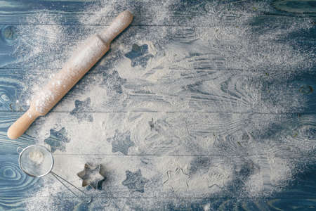 Christmas time cooking concept with flour and cookies forms on dark wooden table