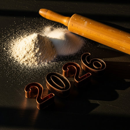 Flour dust rises and dances in the air above a rustic wooden table, creating a lively bakery scene with a focus on motion and texture.
