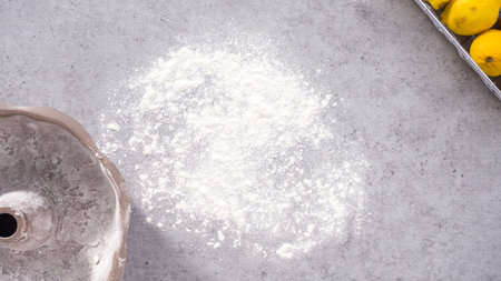 Flat lay. Step by step. Greasing bundt cake pan to bake lemon cranberry bundt cake.
