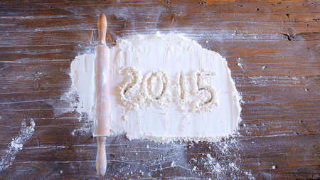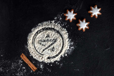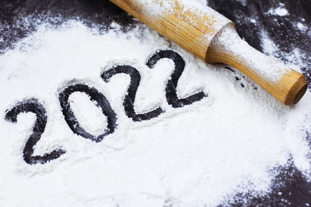 Flour on a black background in the form of numbers 2022 New year and Christmas cooking at home