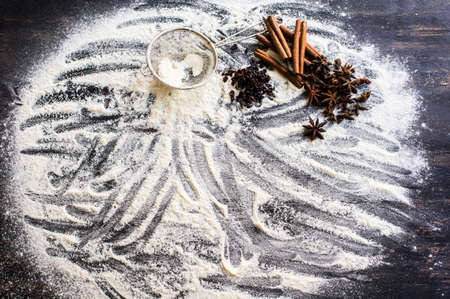 flour shapes kitchen art background concept. creative cooking cuisine process. negative space.