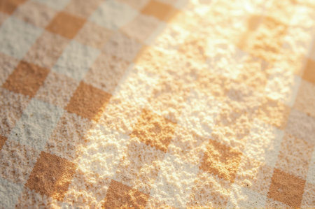 Sunlit flour dusted checkered tablecloth with patterned surface. That the image is generated using AI.