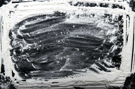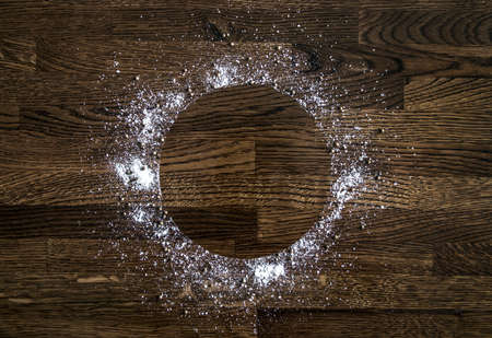Scattered flour in form oval with inscription clean on a gray decorative plaster background.