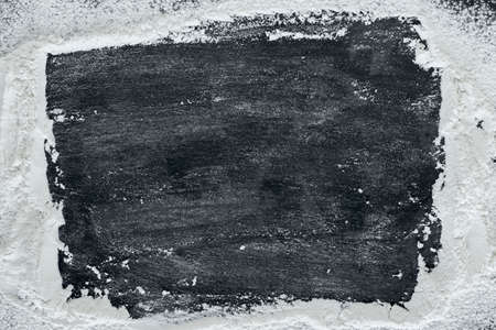 White flour splash spot on black background. Top view on blackboard. Baking concept, cooking dough or pastry.