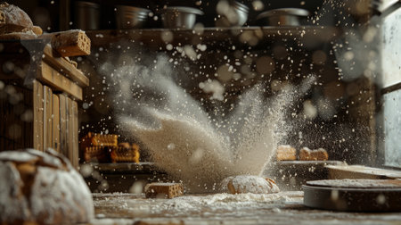 A dynamic scene captures a cloud of flour dust exploding over loaves of bread in the traditional setting of a rustic bakery.
