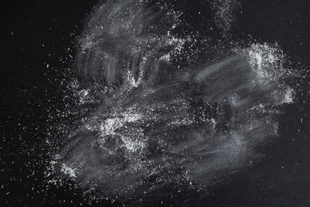 Artistic black and white image showcasing a fine white powder spread artistically across a dark surface, creating an intriguing contrast and texture.