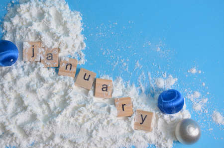 Snow Christmas toys on a blue background. The month of January is written in wooden letters. The calendar. Winter.