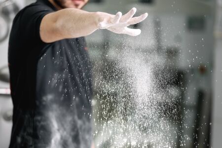 male hands the chef in flour, cotton palm, the process of making bread. Mini bakery