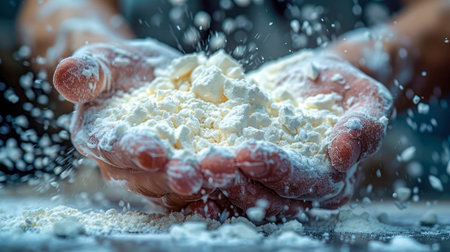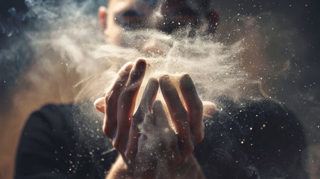 A captivating image showcasing hands releasing white powder into the air, creating a visually striking effect with dynamic motion and soft focus.
