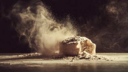 A dramatic close-up of flour bursting into the air, creating a cloud effect against a dark backdrop, highlighting the artistry of baking.