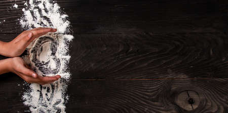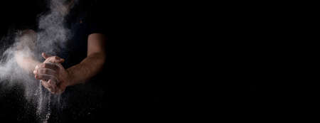 Culinary theme. Banner. Place for your text. A cloud of flour scatters from male hands on a black background.