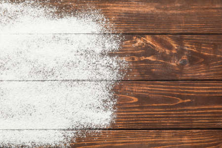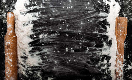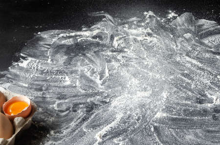 Flour on a table in a bakery, preparation of bread, background with place for text