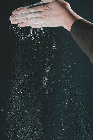 hand of woman cook in kitchen pouring white dust flour flour table for cooking bread isolated on black background 2020