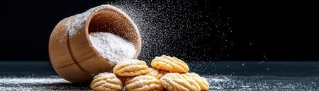 A captivating view of flour cascading from a wooden container onto freshly baked cookies, creating a delightful baking atmosphere, perfect for culinary enthusiasts.