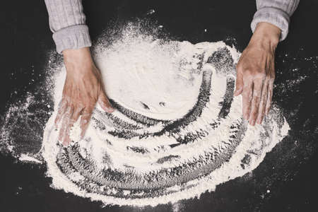 Sifted white wheat flour on a black table and two female hands, top view. cooking at home