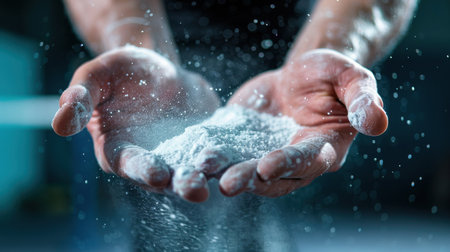 Close-up of hands holding and sifting white powder, symbolizing baking or sports preparation.