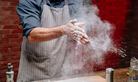 professional chef prepares dough from flour. Powdery flour flying into air. men hands with flour splash. Hands kneading raw dough. Culinary, cooking, bakery concept