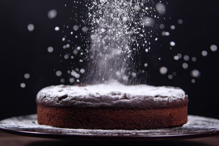 Delicious round chocolate cake sitting on a dark background, being generously sprinkled with powdered sugar for an elegant touch