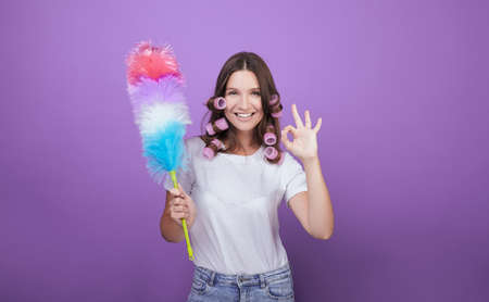 Beautiful angry and frustrated maid or upset housewife with curlers holding a dust brush in stress at home and in the housework. Homemade routine.
