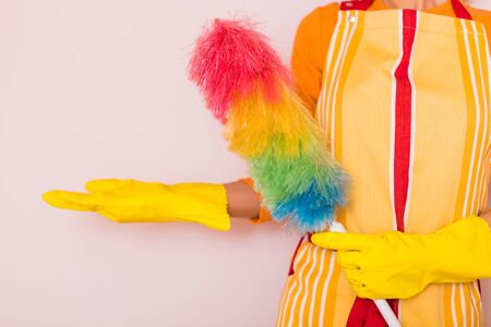 Colorful feather duster in hand on yellow background. Cleaning concept.