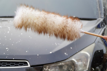 Man holding a Merino Wool Duster a dusty black car. Cleaning service.