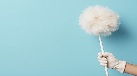 A pair of white-gloved hands holds a fluffy cleaning duster against a light blue backdr