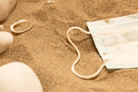 Waste during COVID-19. Scrapped to ocean coronavirus single-use face masks. Environmental and coastal plastic pollution. Trash on the beach that threatens the health of the oceans.