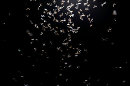 Numerous mosquitos swirling in the air at sunset create a captivating bokeh effect, with a blurred background showcasing warm colors and the enchanting atmosphere of twilight