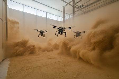 Multiple drones fly through a thick cloud of dust within a large industrial space, showcasing advanced technology.