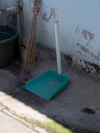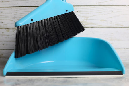 Closeup of a old-fashioned broom and plastic dustpan
