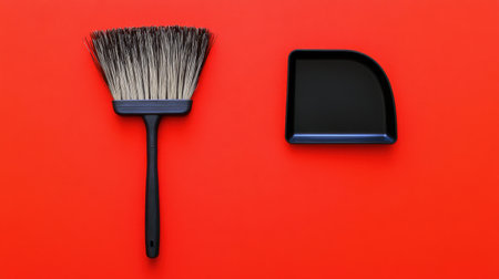 This image features a black cleaning brush alongside a sleek paint tray, set against a vibrant red background, perfect for design projects and home improvement.