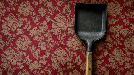 A vintage metal shovel with a wooden handle rests on an ornate red textile background. This still-life captures rustic charm and is ideal for gardening or decor.