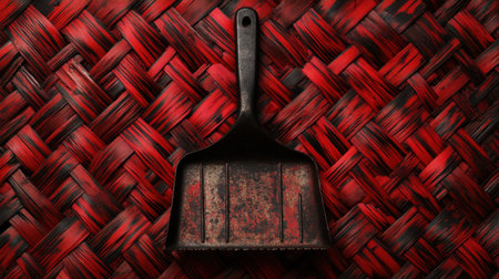 A vintage dustpan placed on a striking woven background showcasing red and black shades. This image captures the beauty of rustic home decor and artistic textures.