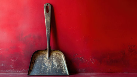 A vintage metal dustpan rests against a textured red wall, showcasing an appealing contrast that adds character to any cleaning space or decor style.