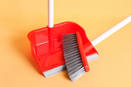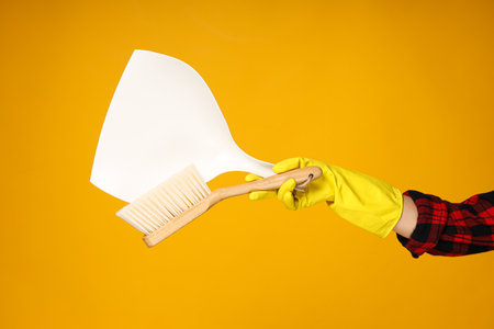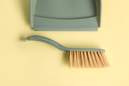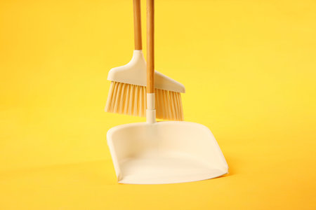 Dustpan and cleaning brush on yellow background