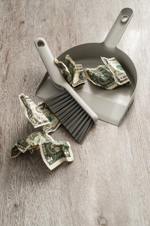 Dollar banknotes, dustpan and broom on floor, closeup