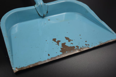 Dustpan and dustpan on a black background. Selective focus. A blue metal scoop from which the paint has come off is located on a black matte background.