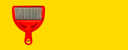 Red dustpan and brush lying on yellow background. In the style of pop art. Top view.