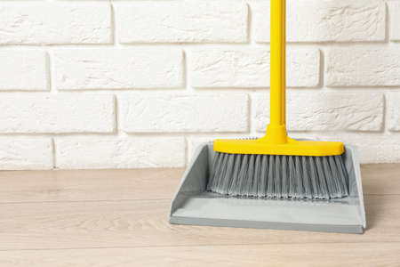Plastic whisk broom with dustpan near white brick wall indoors. Space for text